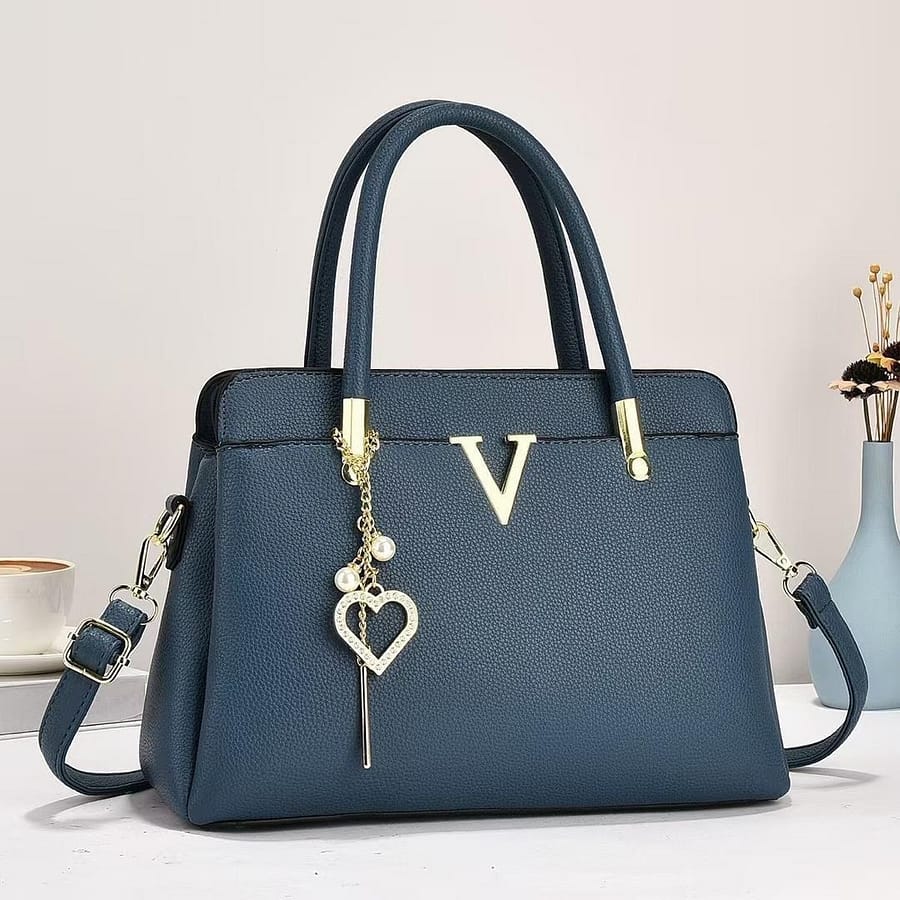 The bag features a crisp, structured silhouette that maintains its shape, highlighted by polished gold-tone hardware. The centerpiece is a sleek metallic “V” emblem on the front panel, complemented by a delicate, crystal-embossed heart and pearl charm that dangles gracefully from the handle base. With its dual rolled top handles and a detachable, adjustable crossbody strap, this satchel is the ultimate versatile companion for the modern woman who values both style and functionality.