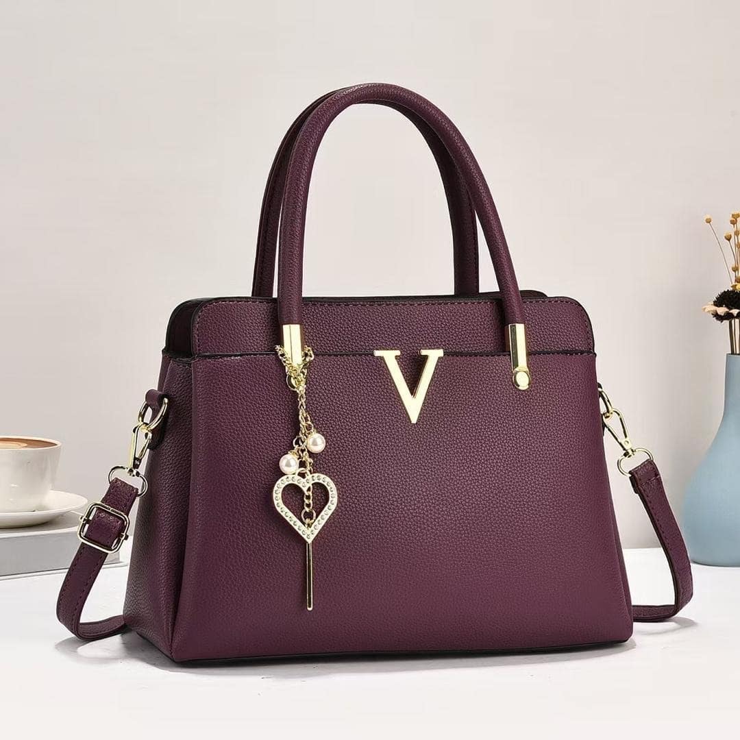 Elevate your accessory game with this Luxury V-Emblem Vegan Leather Satchel, a masterclass in combining classic structure with feminine charm. Crafted from premium, pebble-textured vegan leather, this handbag offers a high-end look and feel while remaining durable for everyday use. The deep, royal plum hue serves as a sophisticated neutral, adding a pop of rich color that pairs beautifully with both professional office attire and elegant evening wear.