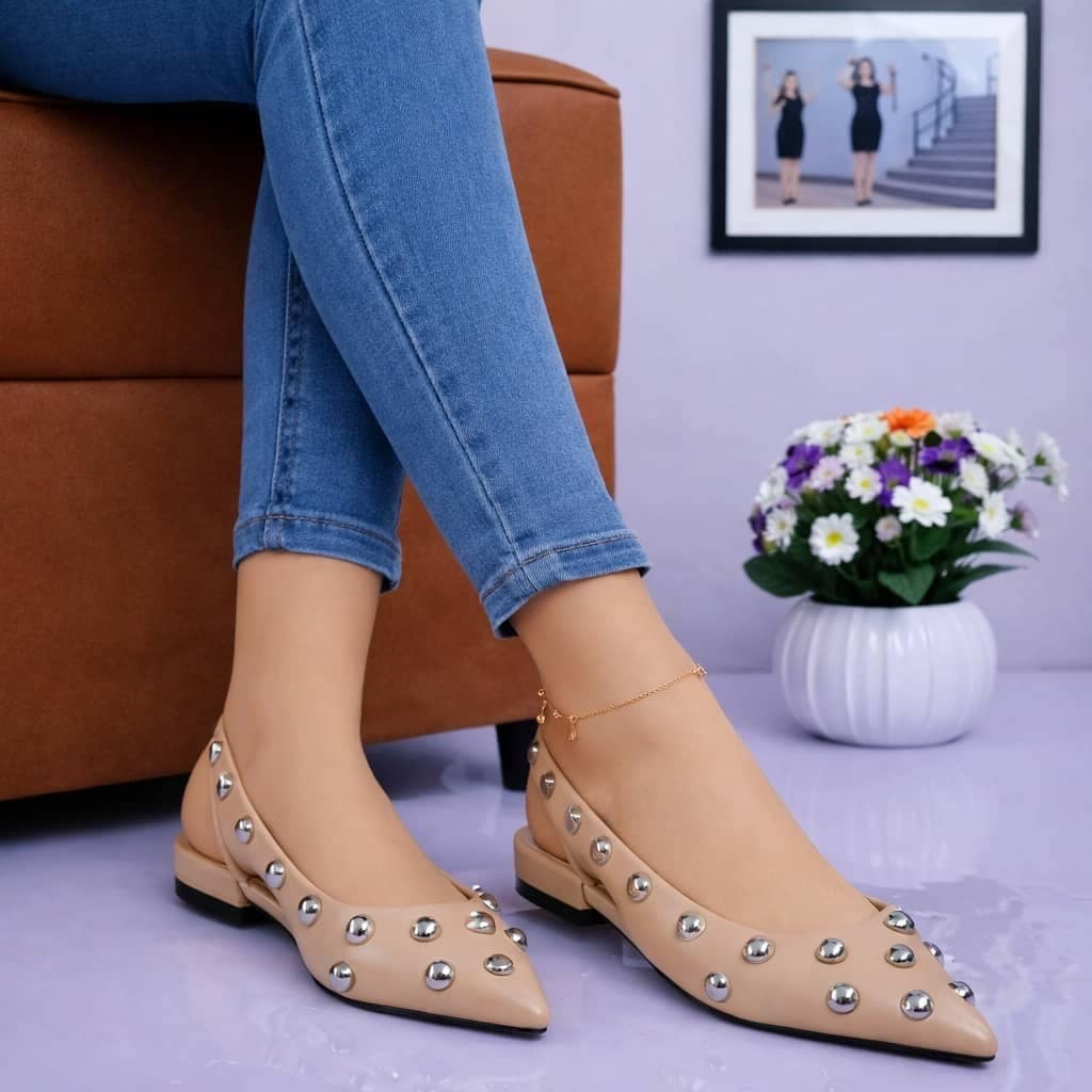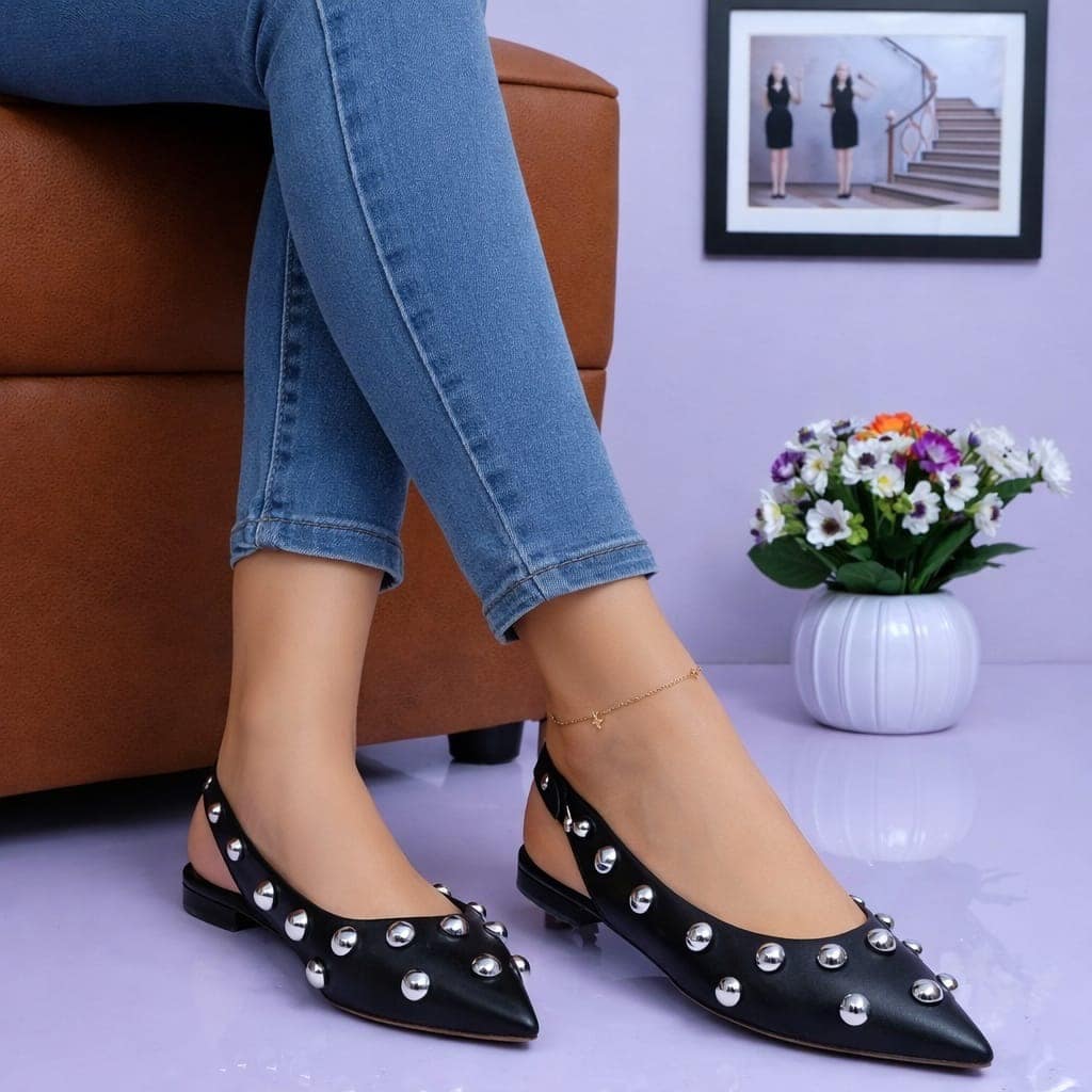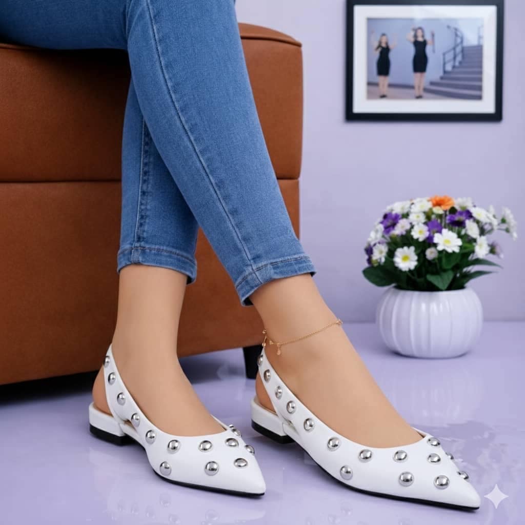 Redefine your daily wardrobe with our Heritage Architectural Studded Flats, a masterclass in blending edgy modernism with timeless grace. These flats are designed for the contemporary woman who seeks the perfect intersection of high-fashion aesthetics and all-day comfort. Featuring a razor-sharp pointed-toe silhouette, these slingbacks elevate the traditional flat to a piece of wearable art through their unique 3D hardware.
