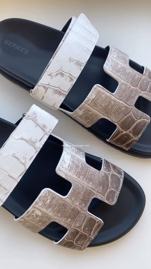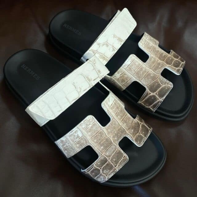 Experience the ultimate in coordinated luxury with the Hermès Exotic Textured Collection. This stunning set includes a high-quality, structured top-handle satchel and a matching pair of the iconic “H” silhouette slides, both featuring a sophisticated crocodile-embossed finish. The collection showcases a masterful gradient design, transitioning from crisp white to deep earthy tones, creating a multidimensional look that is both timeless and modern.