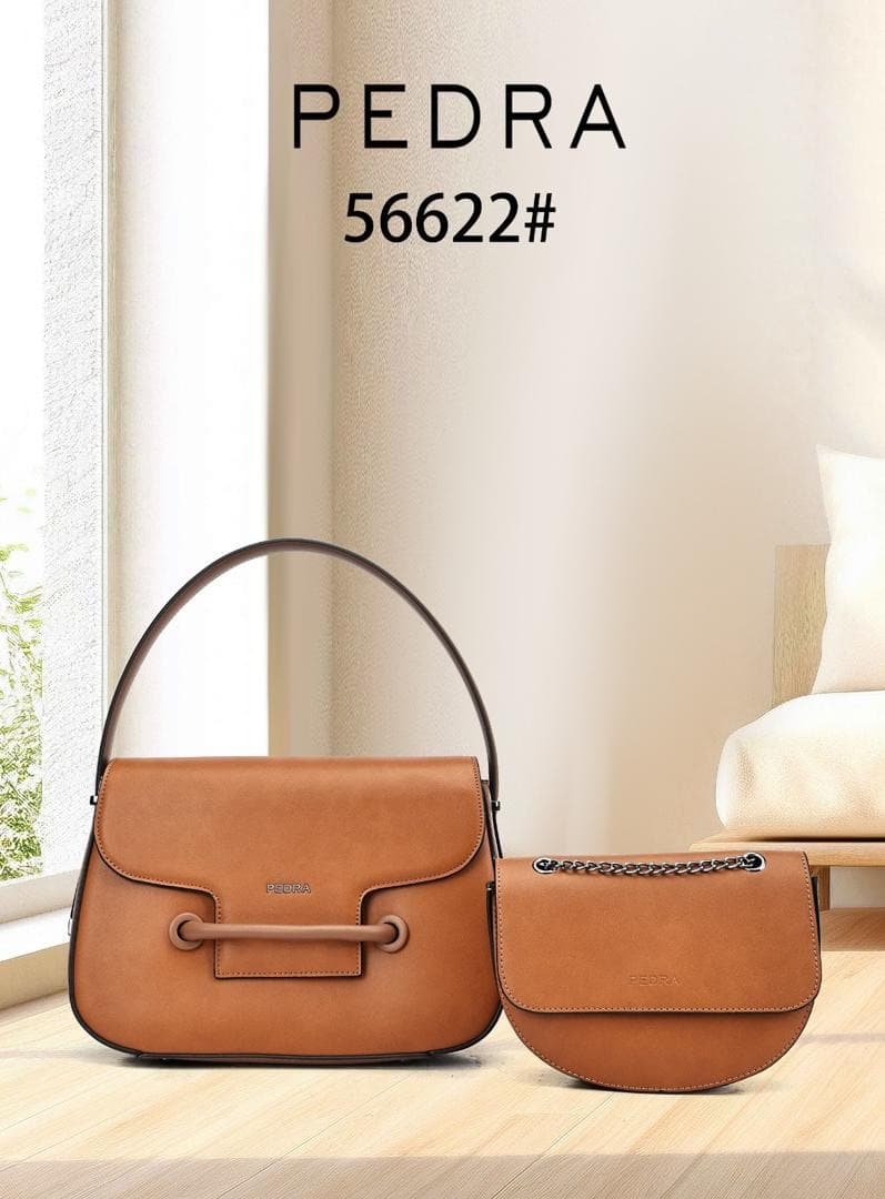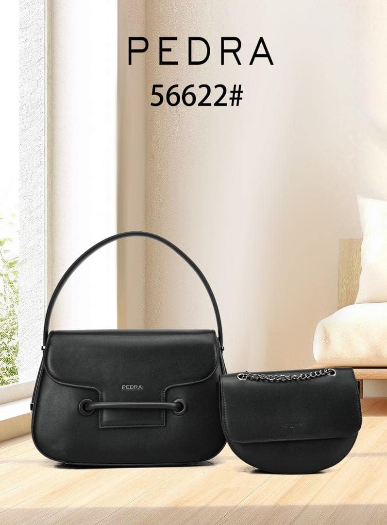 The primary bag features a contemporary bi-tonal flap design, secured by a custom geometric metallic clasp that reflects urban sophistication. A polished mixed-media chain strap allows for versatile styling as a shoulder bag or a long-carry tote. The accompanying secondary bag is a clean-lined essential, featuring a refined top handle and a secure magnetic flap, making it the perfect standalone piece for events where only the essentials are required. Together, this PEDRA set represents the pinnacle of versatile luxury, providing a complete accessory solution in one exquisite package.